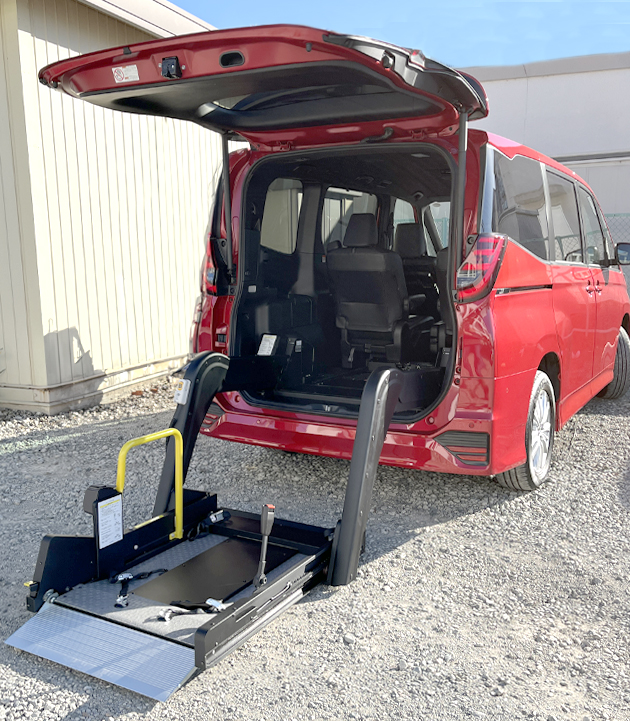 外出先でもわかりやすい赤いボディカラーです。電動リフトを装備しておりますので車椅子の乗降もスムーズです。